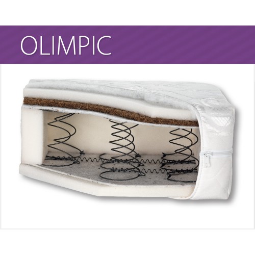Materac OLIMPIC wykonany został z dużą starannością, z wysokiej jakości materiałów. Dzięki czemu zwiększa komfort podczas nocnego odpoczynku. Zastosowano w nim sprężyny bonellowe, które dają optymalne podparcie dla każdego ciężaru. Wkład sprężynowy obłożony jest z jednej strony przekładką tapicerską i matą kokosową pokrytą naturalnym lateksem, a z drugiej strony pianką poliuretanową. Mata kokosowa to naturalny surowiec o właściwościach higroskopijnych i antyalergicznych, gdyż zapobiega namnażaniu w niej roztoczy. Zapewnia również odpowiednią cyrkulacje powietrza.